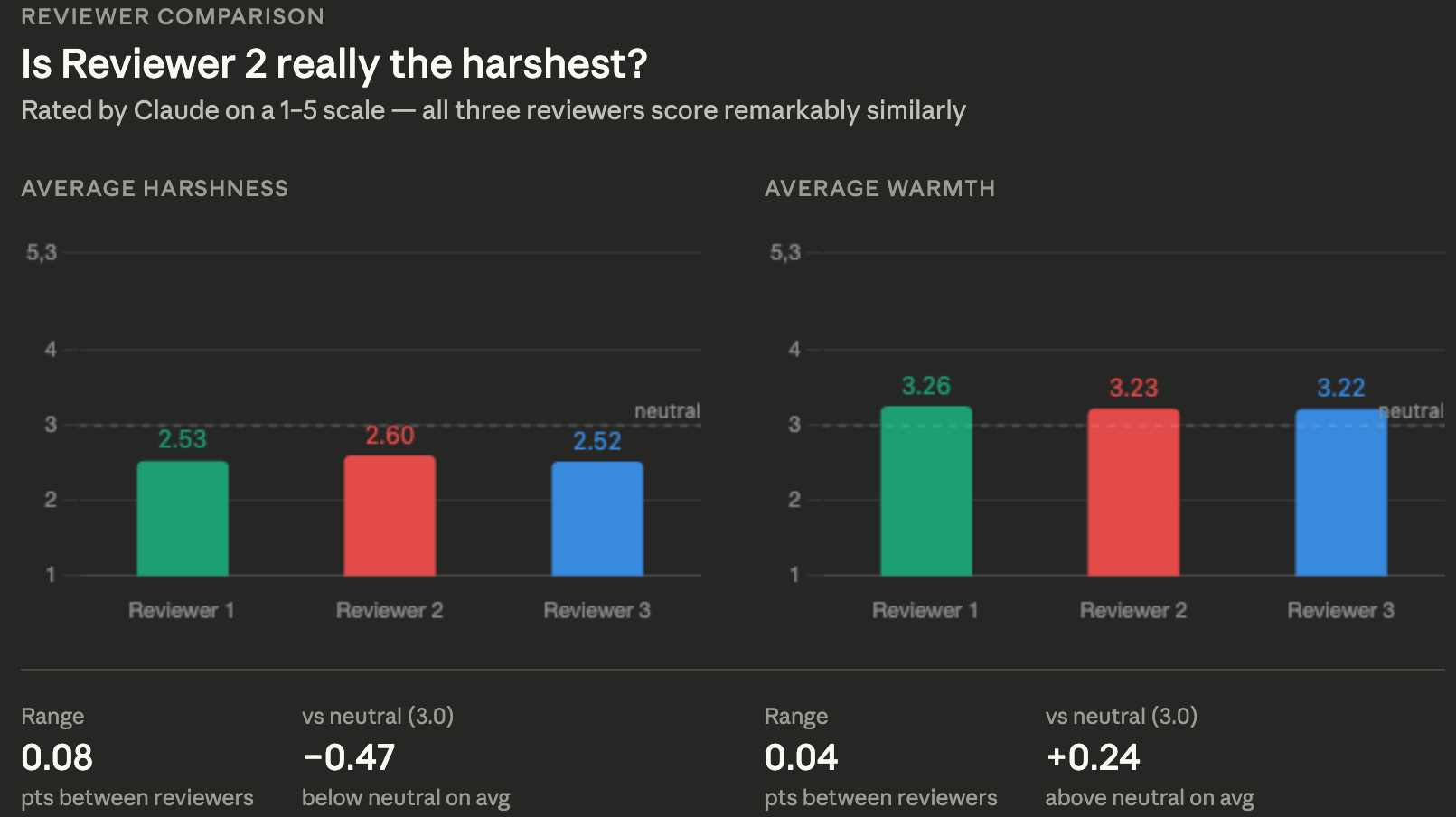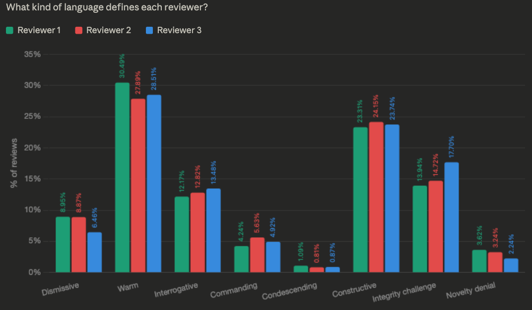Obviously, I then asked Claude to read all these reports (RIP my API credits) and tell me about the tone of the texts. Here I only took the first versions of the reports, meaning only the reviewers’ comments were there (no author comments), and I only focused on reviewers #1, 2 and 3 (since the majority of manuscripts had 2-3 reviewers, see Figure 1. No, no, no; don’t look at it. Stay right here. Let's not pretend this is scientific).