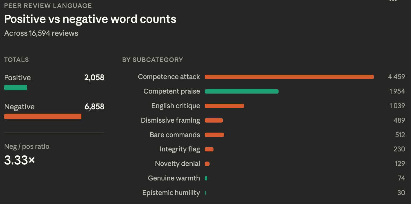 First, looking at all reports in general (reviewers + authors comments), Claude focused on positive vs negative words of its own choosing and concluded that review reports have 3.33 times more negative words than positive words. Are we surprised?